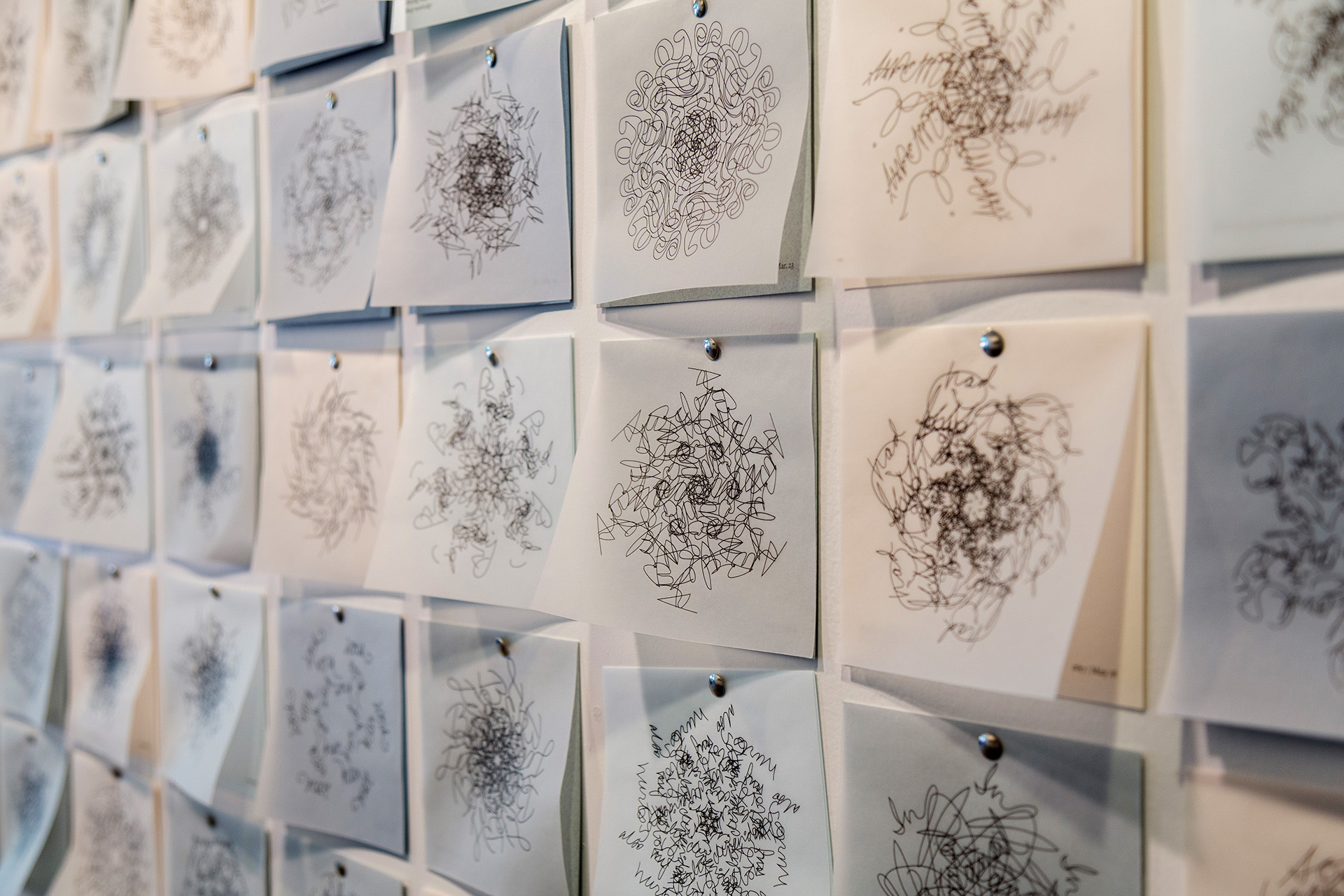 Accumulation is an ongoing bedtime ritual. Each captured phrase connects to the experience of living through the day, and each resulting six-sided form reframes its content. Together, these memories create an intricate, illegible cloud, the original sentiments obscured but not erased.